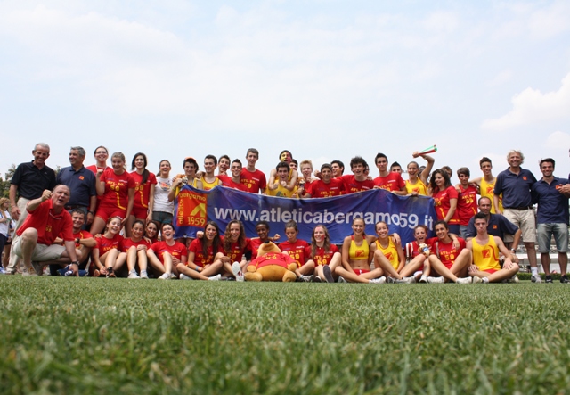 La 54esima stagione giallorossa si apre con il riassetto societario, che segna l’addio alla presidenza dopo 29 anni di Dany Eynard, uno dei padri fondatori della società, nominato all’unanimità dal nuovo consiglio presidente onorario. Il testimone passa a Dante Acerbis, che diventa così il sesto presidente della storia, dopo Giuseppe Tombini, Nunzio Tarenghi, Mauro Capponi, Giulio Mazza e, appunto, Dany Eynard. Nuovo vicepresidente diventa Paolo Marabini, mentre per la prima volta entrano in consiglio i rappresentati degli atleti (Federica Castelli e Ivano Pasetti) e dei tecnici (Giovanni Bonarini). Il direttivo è completato da Achille Ventura, Bruno Sgherzi, Alberto Bertinotti, Umberto Lodetti, Renzo Passera, Roberto Alberti e Ferruccio Valenti.Sul fronte agonistico, per la prima volta dalla stagione 2000 l’Atletica Bergamo manca l’appuntamento con la maglia azzurra, ma le soddisfazioni in pista (e non solo) non vengono meno. Anche il 2012, tanto per cominciare, va in archivio con la partecipazione di sei squadre su sei alla finale di serie A dei Societari su pista. Di grande prestigio è il settimo posto della formazione assoluta maschile, che per il quinto anno di fila è tra le top 12 del Gruppo Oro, mentre le ragazze, fresche di promozione, chiudono al 10° posto, non riuscendo così a evitare la retrocessione nel Gruppo Argento. Come da copione il piazzamento migliore lo firmano gli Allievi, che portano a casa il terzo gradino del podio in campo maschile e il 6° posto a livello femminile, mentre dal campionato under 23 arrivano rispettivamente il 7° e l’8° posto. C’è anche uno scudetto ed è quello che gli allievi conquistano nei Societari di specialità per il settore salti, al quale si aggiungono due piazzamenti sul podio delle allieve, rispettivamente nei lanci (secondo posto) e nella velocità (terzo).A livello individuale arriva l’ennesima pioggia di titoli (9) e medaglie (10 d’argento e 7 di bronzo) nei vari Campionati tricolori. La parte del leone la fa la marciatrice Federica Curiazzi, che confeziona l’en plein vincendo tra le Promesse l’oro nei 3000 metri indoor, nei 10000 in pista e nei 20 km su strada, gara questa in cui conquista anche un prestigioso argento assoluto. L’allieva di Ruggero Sala, sfortunata in occasione degli Assoluti su pista (ritiro all’8° km per problemi intestinali) centra anche il secondo posto agli Universitari, confermandosi come l’atleta giallorossa più medagliata di sempre ai campionati italiani. Tra le under 23 brilla anche Isabella Cornelli, i cui continui progressi nel mezzofondo veloce si concretizzano con il titolo italiano di categoria e quello universitario negli 800, oltre che con un brillantissimo quarto posto nella finale degli Assoluti, il bronzo ai Tricolori Promesse indoor e soprattutto un miglioramento sul piano cronometrico di quasi 5 secondi (da 2’11”13 a 2’06”69). Cresce a vista d’occhio anche il ventenne Hassane Fofana, che prima di passare a fine stagione nelle Fiamme Oro, regala alla società madre due medaglie tricolori di categoria (argento all’aperto sui 110 hs e bronzo indoor sui 60 hs) e il quarto posto agli Assoluti, scendendo sino a 13”91, tempo che alla fine lo colloca al quinto posto nella graduatoria italiana stagionale. C’è gloria poi per Michele Oberti, che agli Assoluti indoor strappa un bellissimo secondo posto nella finale degli 800 e chiude la stagione limando altri centesimi preziosi al personale, con un 1’48”62 che gli vale il sesto tempo italiano dell’anno.